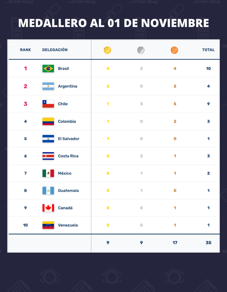 En la clasificación general, Brasil lidera con 10 medallas (4 de oro, 2 de plata y 4 de bronce), seguido por Argentina, que marcha en la segunda posición con 4 preseas (2 de oro y 2 de bronce).