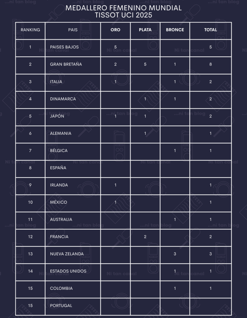 Países Bajos se quedó con el primer lugar del medallero en el Mundial de Ciclismo en Pista Tissot UCI Santiago 2025, tras la última jornada de competencias disputada el domingo 26 de octubre en el Velódromo de Peñalolén.