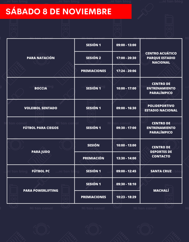 A continuación, se presenta el calendario de competencias, que se desarrollará del 6 al 9 de noviembre, junto con sus respectivas sedes: