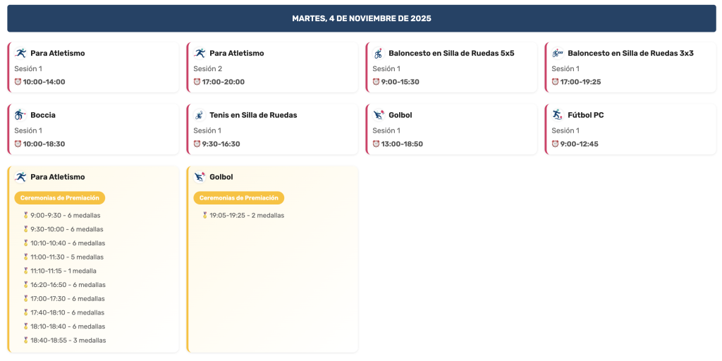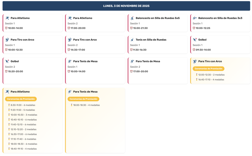 Este es el calendario por deportes, sesiones que comprende desde el 3 de noviembre hasta el 5 de noviembre.